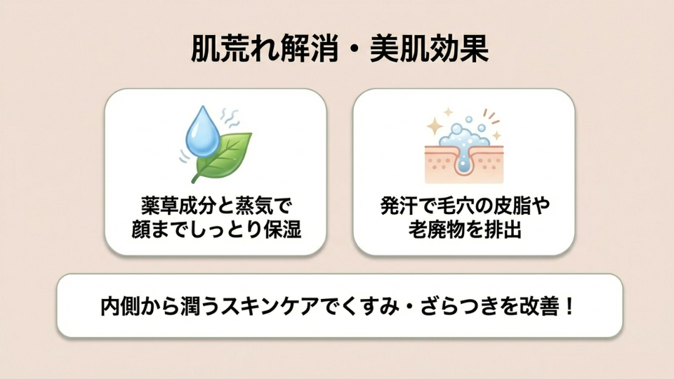 大量の汗とともに、毛穴に詰まった皮脂や老廃物が排出されるので、毛穴のざらつきやくすみの改善が期待できます。